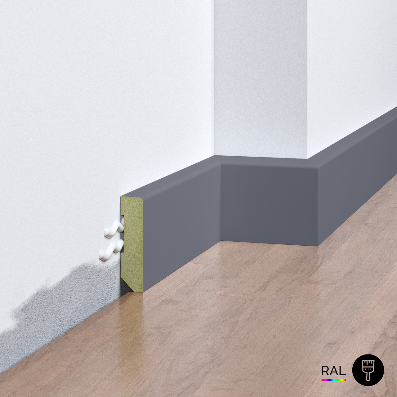 Мінімалістичний дизайн дозволяє використовувати його в сучасних стилях. Плінтус виготовлений з якісного вологостійкого МДФ, покритий ґрунтом та фарбою австрійської компанії ADLER. Безпечний та практичний у використанні — стійкий до побутової хімії та ультрафіолетового випромінювання. Встановлюється на усі типи поверхонь стін.